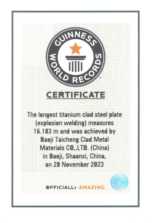 近日,公司张雪峰教授团队与四川钛程钛业有限公司合作开发的爆炸成型制备大规格钛钢复合板成功挑战吉尼斯世界纪录,获得“最长的钛钢复合板(爆炸成型)”吉尼斯世界纪录称号。