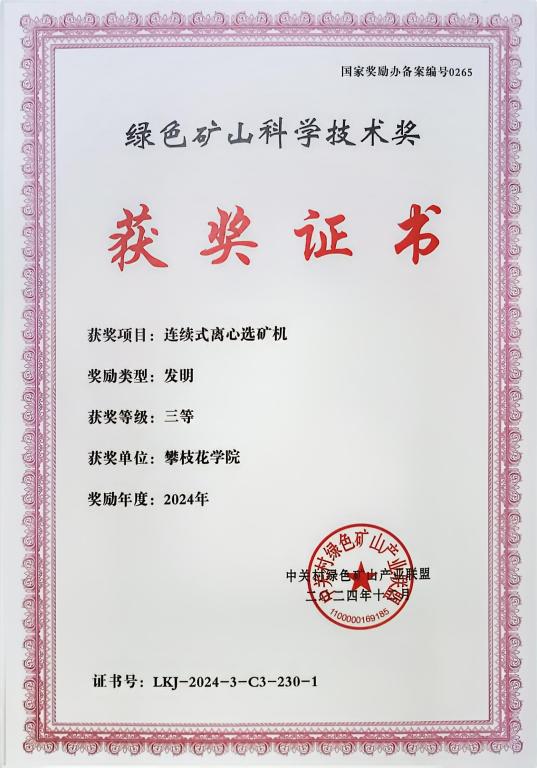 近日,在北京举办的第二届中国绿色矿山国际年会暨2024年度绿色矿山科学技术奖颁奖大会上,公司公司徐国印老师的“连续式离心选矿机”荣获绿色矿山发明三等奖,参与的《攀西大宗工业固废在土木工程中的负碳资源化利用成套关键技术及应用》项目荣获绿色矿山科技进步一等奖。
