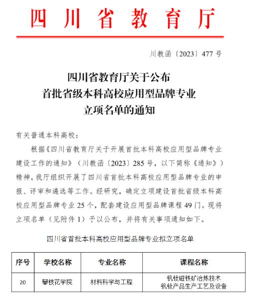 近日,四川省教育厅公布了首批省级本科高校应用型品牌专业及课程立项名单,经专家通讯评审、会议评审和厅长办公会审议等程序,公司伟德国际1949始于英国料科学与工程专业获批首批省级本科高校应用型品牌专业,为公司唯一入选专业。同时,“钒钛磁铁矿冶炼技术”和“钒钛产品生成工艺及设备”两门课程被列入应用型品牌课程建设名单。