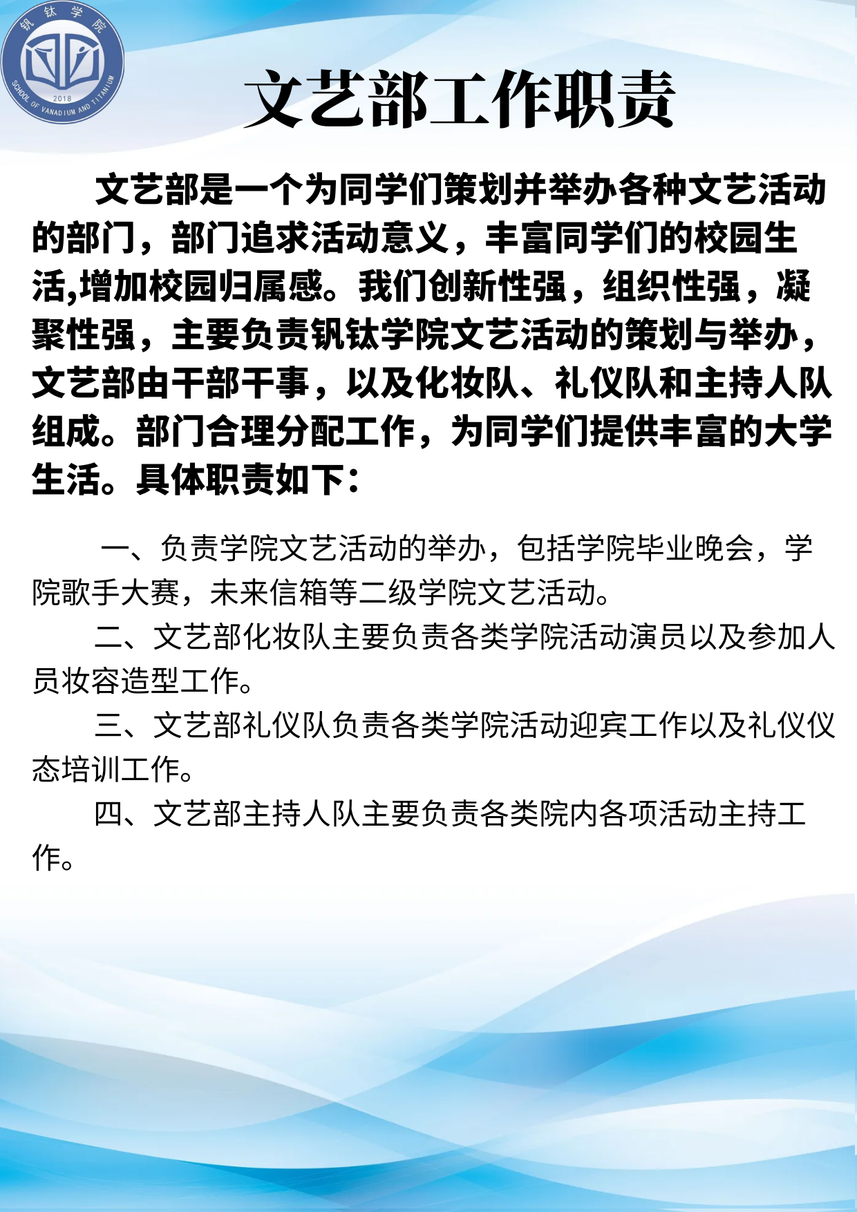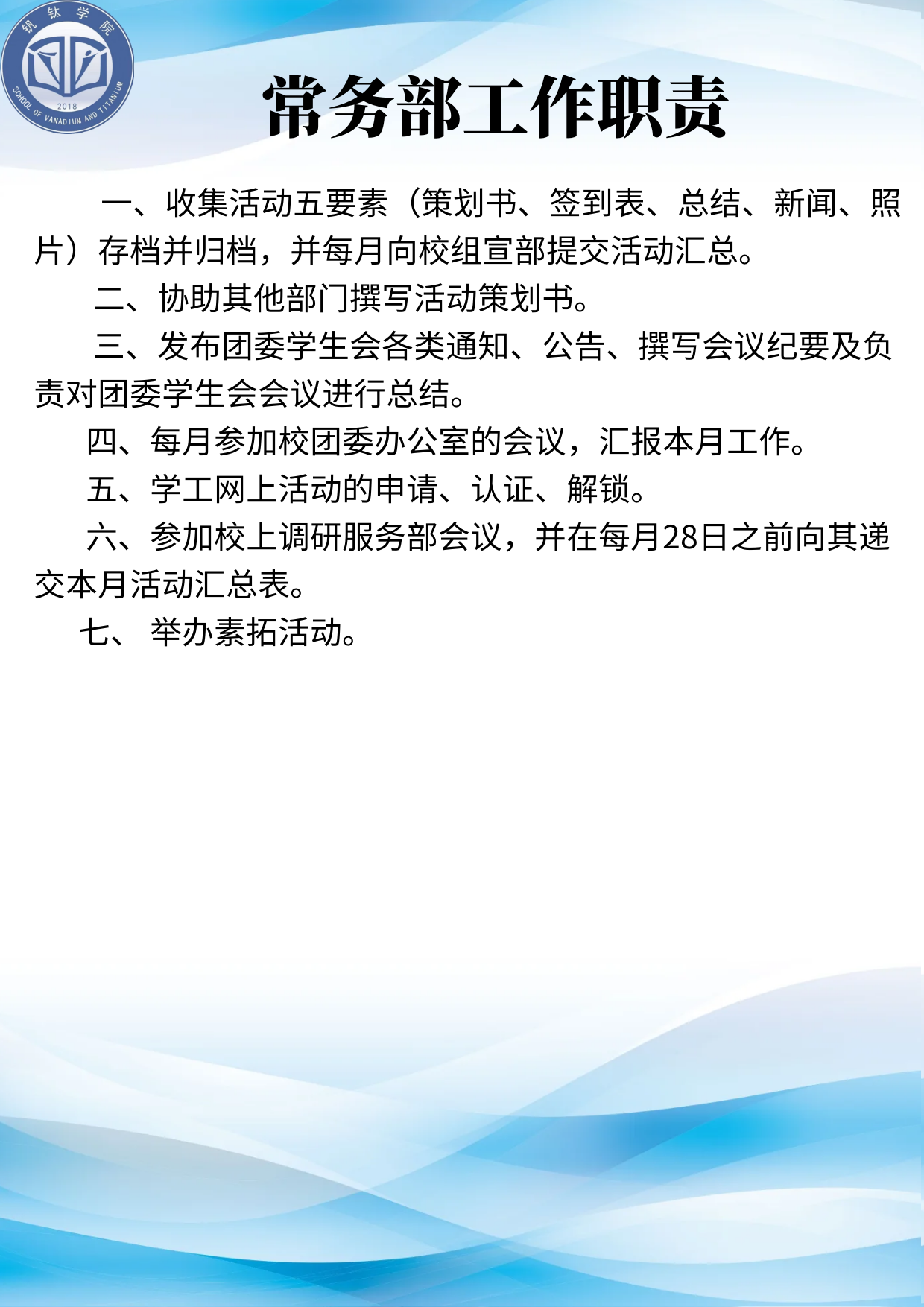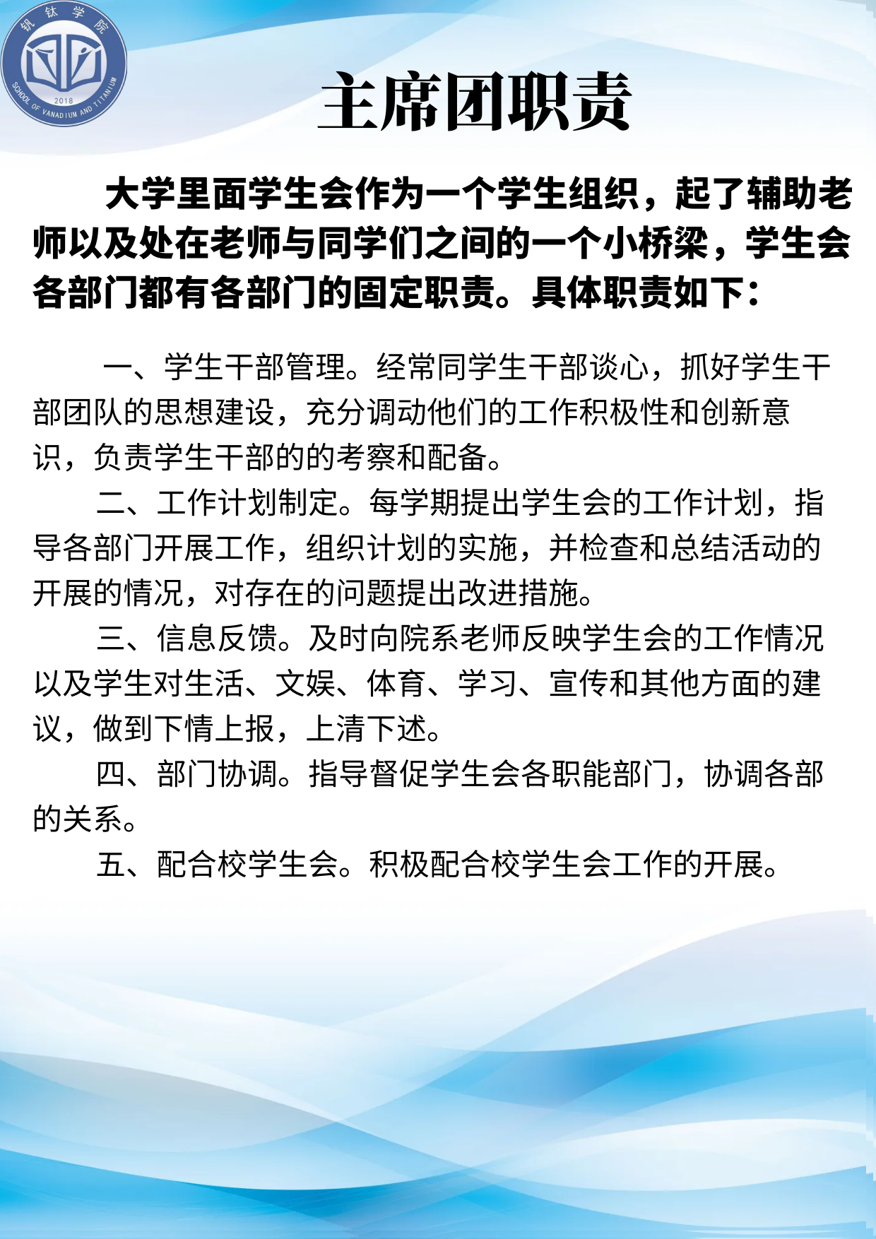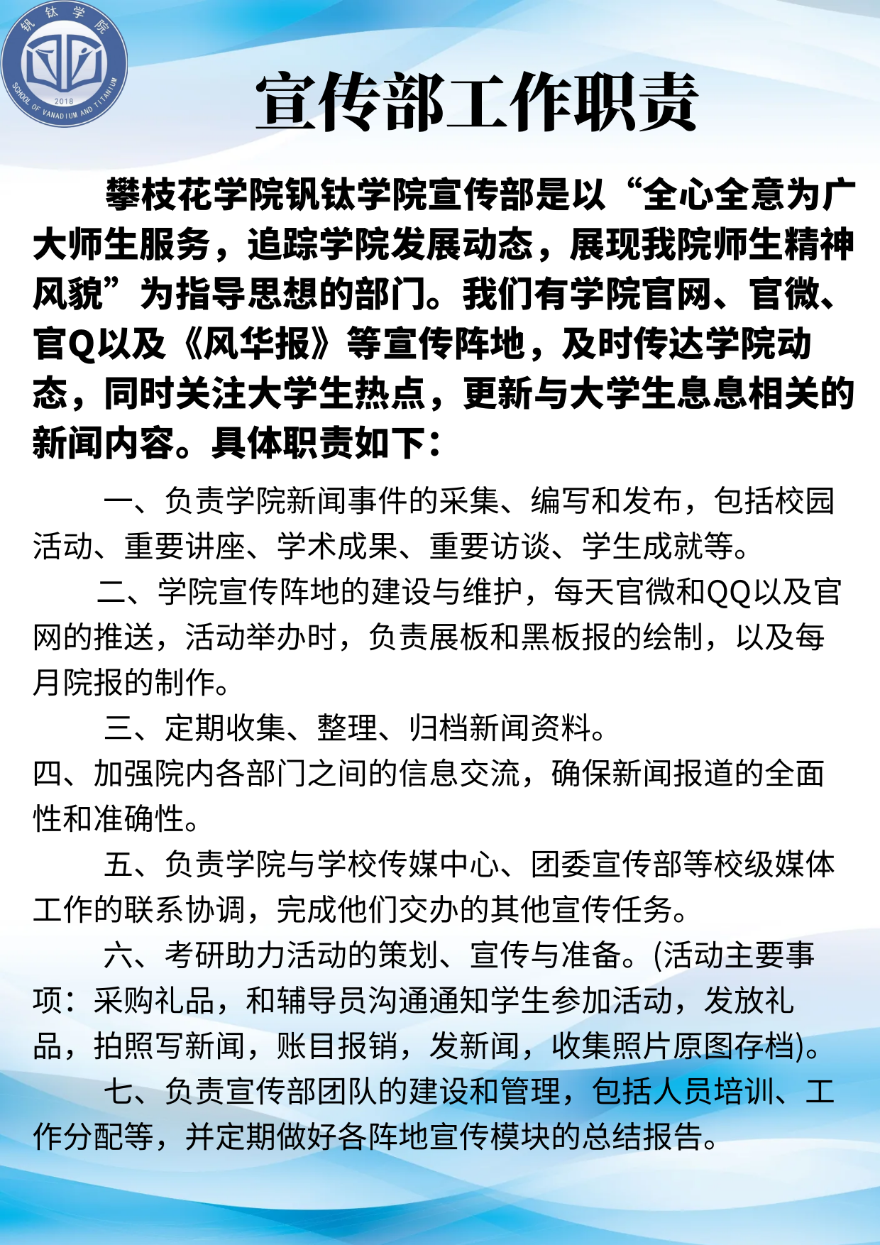 各部门部长(组织部、宣传部、社团团支部、外联部、文艺部、体育部、常务部、心理部、纪检部、学术创新部、钒钛服务站)