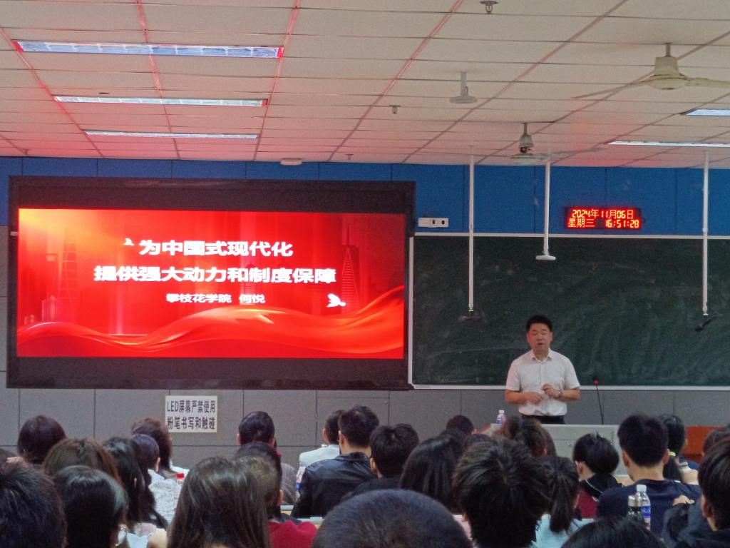 在党课过程中,何悦副教授以其深厚的理论功底和饱满的精神,深入浅出地解读了二十届三中全会的核心内容和实质。他详细介绍了改革开放前后全会的伟大历史变革,强调了二十届三中全会是党中央在以中国式现代化全面推进强国建设,民族复兴伟业的关键时刻召开的一次十分重要的会议,详细解析了会议的议程、《决定》的起草、框架布局、内容特点等。此次党课脉络清晰、重点突出、内容详细,很好地帮助了师生们准确理解和全面把握党的二十届三中全会精神。